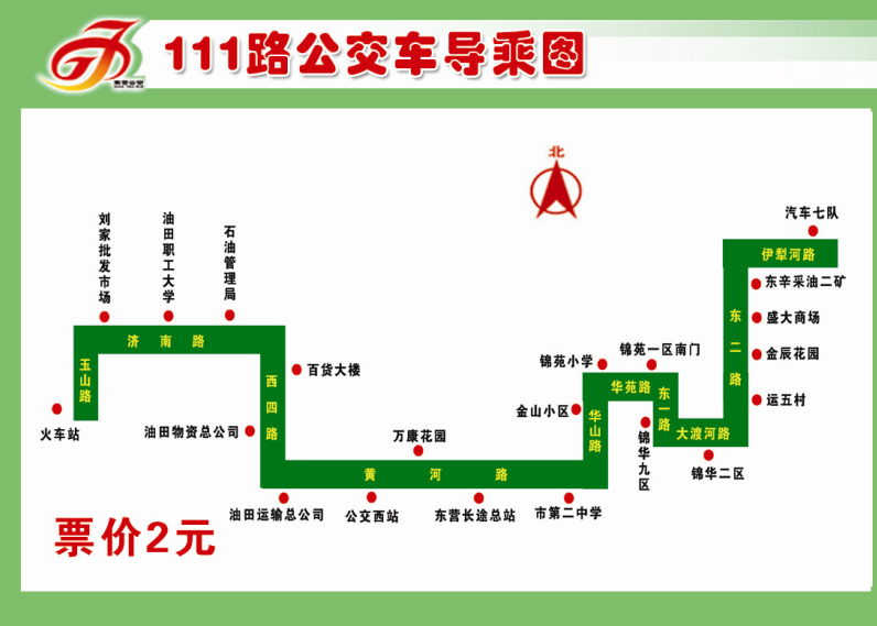 111路:該線路自汽車七隊始發(fā),經伊犁河路(華瑞小區(qū))、東二路(盛大商場、運五村)、大渡河路(錦華五區(qū))、東一路(錦華九區(qū)),改經華苑路(錦苑一區(qū)南門、錦苑小學)、華山路(金山小區(qū)),到達黃河路后,恢復原線路,單程里程24.3公里,票價、班次均不變。