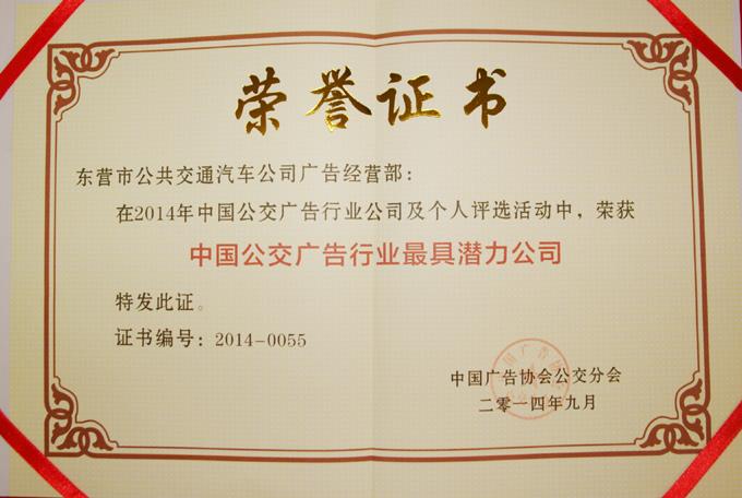 近日,在中國廣告協(xié)會公交分會舉行的《中國公交廣告行業(yè)最具影響力公司》和《中國公交廣告行業(yè)最具潛力公司》評選活動中,東營市公交公司廣告部喜獲“中國公交廣告行業(yè)最具潛力公司”稱號,這表明在公司領導的大力支持和全體職工的共同努力下,經(jīng)廣告行業(yè)協(xié)會的規(guī)范引領,廣告部的各方面工作已經(jīng)取得了穩(wěn)步的發(fā)展,具備了一定競爭實力,這一稱號,將進一步激發(fā)全體廣告職工的工作熱情,以整體強勁的勢頭,投身到激烈的行業(yè)競爭當中,再創(chuàng)更好的經(jīng)濟效益和社會效益。