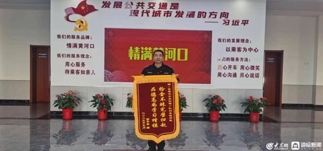 近日,失主楊佳琛帶著一面寫有“拾金不昧完璧歸趙,品德高尚學(xué)習(xí)榜樣”的錦旗來到東營公交公司汽車一隊,感謝車隊121路駕駛員劉永波的拾金不昧。