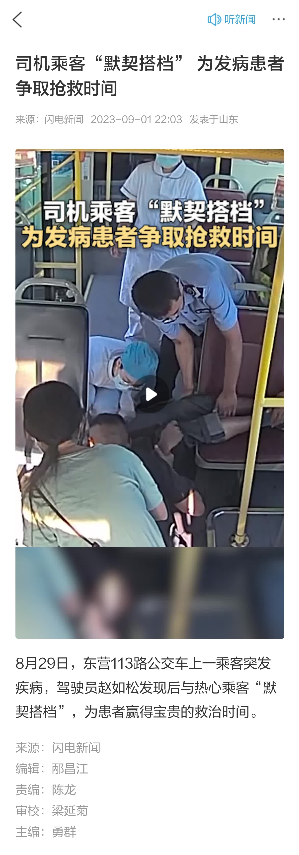 2023年8月29日下午4點(diǎn)58分左右,正在駕駛113路公交車的趙如松聽到了車內(nèi)乘客的呼救。他從車內(nèi)后視鏡看過(guò)去,發(fā)現(xiàn)車內(nèi)一男性乘客正在渾身抽搐,然后倒地不起,此時(shí),坐在他后方的一名乘客見狀,立馬跑到駕駛員旁邊呼救。趙如松師傅馬上靠邊停車,并上前查看乘客情況,因接受過(guò)急救培訓(xùn),趙師傅立馬判斷,該乘客可能是突發(fā)疾病,在向公司匯報(bào)并征得車內(nèi)乘客同意后,立即將公交車開往醫(yī)院,為患者爭(zhēng)取急救時(shí)間。車輛到達(dá)到市人民醫(yī)院南門后,趙如松和急救人員合力將患者抬到急救擔(dān)架上,一起送到急救室,看著他情況穩(wěn)定后,才返回工作崗位駕車駛離。